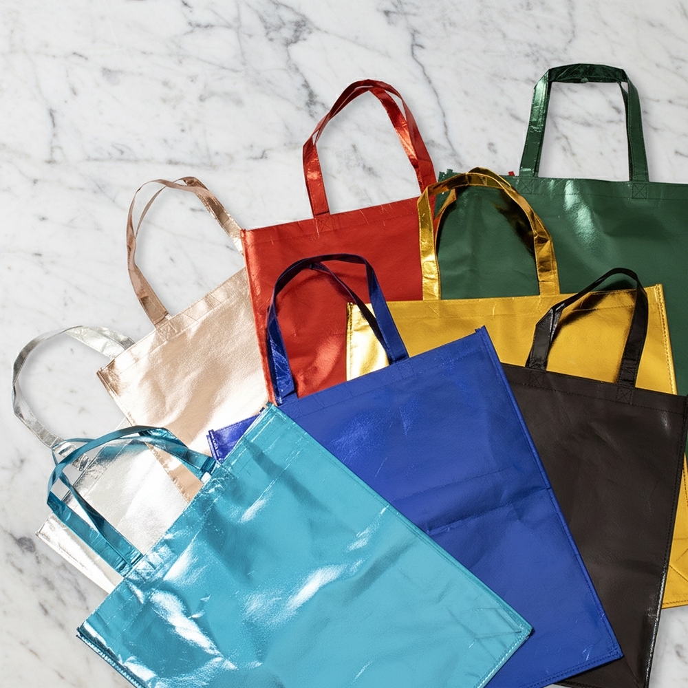 Sacola confeccionada em TNT com revestimento externo laminado e duas alças costuradas.